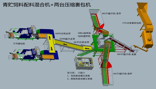 青貯飼料稱重配料→攪拌混合→自動(dòng)進(jìn)料→壓縮成捆→預(yù)包膜→物料輸送→最終包膜→成品輸出